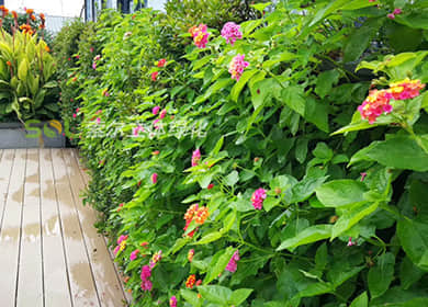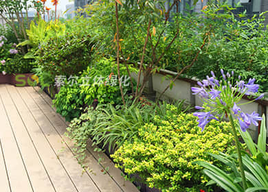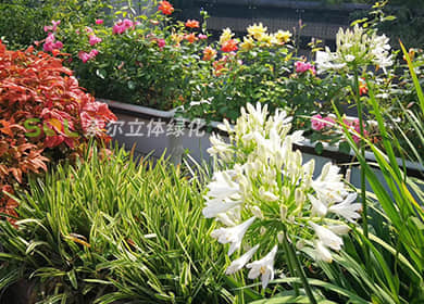 屋頂花園,考慮到屋頂的承重、立體景觀效果及遮擋容器,植物要有高低層次,觀葉植物色彩要多樣,觀花植物花朵顏色多、或花朵數量多、或花朵較大。