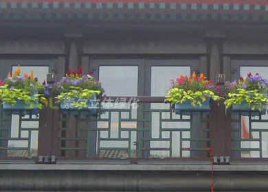 陽臺花園護欄雙面掛,利用兩只立體鞍式綠化箱SL-XA5060、三層立體鞍式綠化箱SL-XA6533,配以花草加灌溉系統(tǒng),固定于護欄欄桿,形成立體景觀效果。