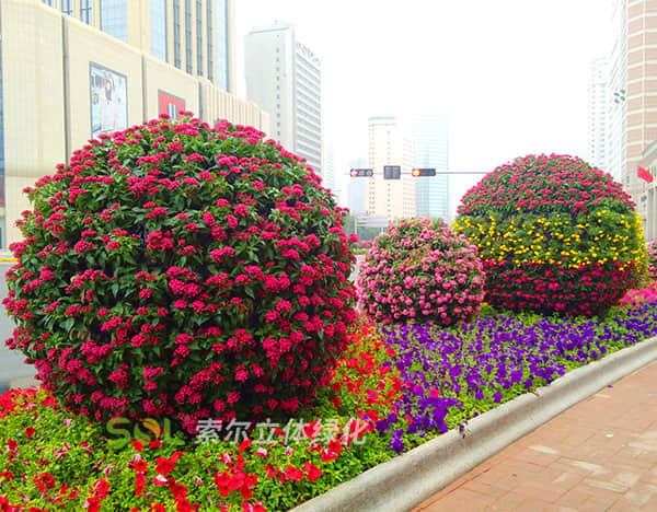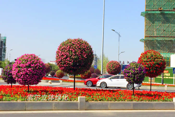 花球可應用于市政道路景觀提升,人行道空地及綠化帶、中央隔離帶、環島、十字路口綠地等、綠雕及花境中的造景應用。