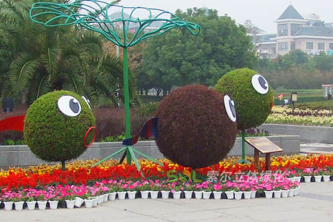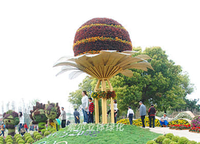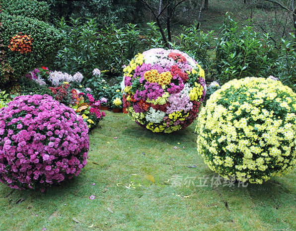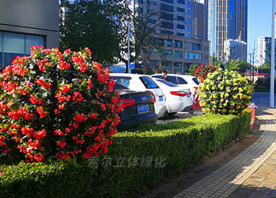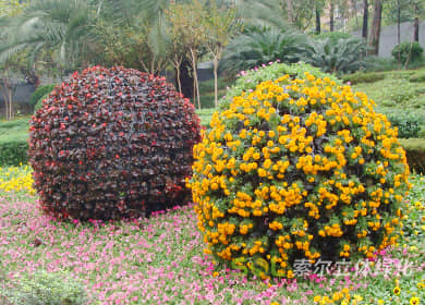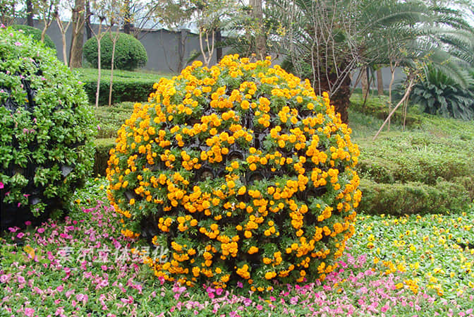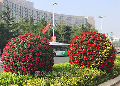 花球既能獨立成景,又可在綠雕中應用,方式多樣。節日、慶典、會議、活動等重要項目都可運用,用紅色系、橙色系、黃色系等花卉,烘托熱烈氣氛。